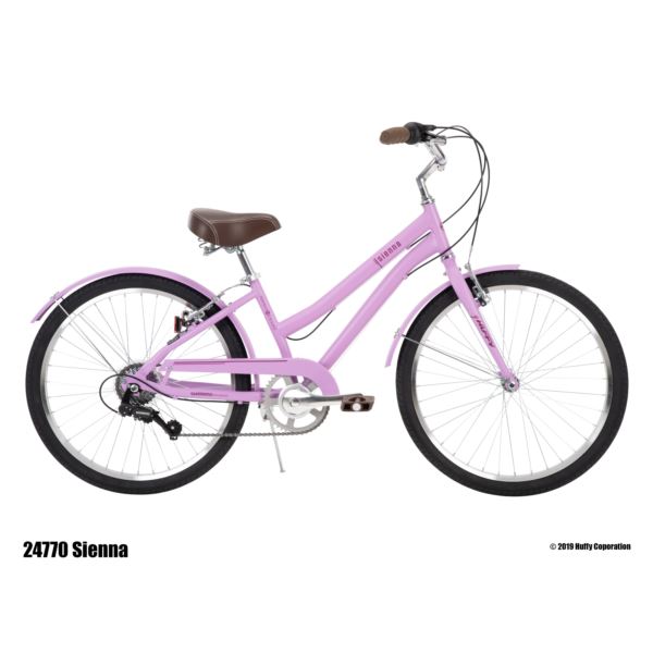 The Sienna 24" cruiser has a Hi-ten steel Perfect Fit frame. It features a steel unicrown fork; 7-speed Shimano RevoShift and 7-speed index rear derailer for easy shifting and smooth control; front and rear linear brakes; alloy 3-piece crank; fenders; and alloy quick-release seat binder. The deluxe padded spring saddle and dual density grips and pedals deliver total comfort to enjoy rides for every day of the week.