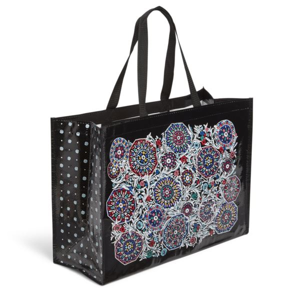 Go Shopping in Style! Be colorful, and green, when you use your reusable Market Tote. Features East-West style, is foldable and reusable, reduces paper and plastic bag waste. Made with 60% recycled material. Wipe Clean. 19" W x 14" H x 7 1/2" D with 9 1/2" Strap Drop.